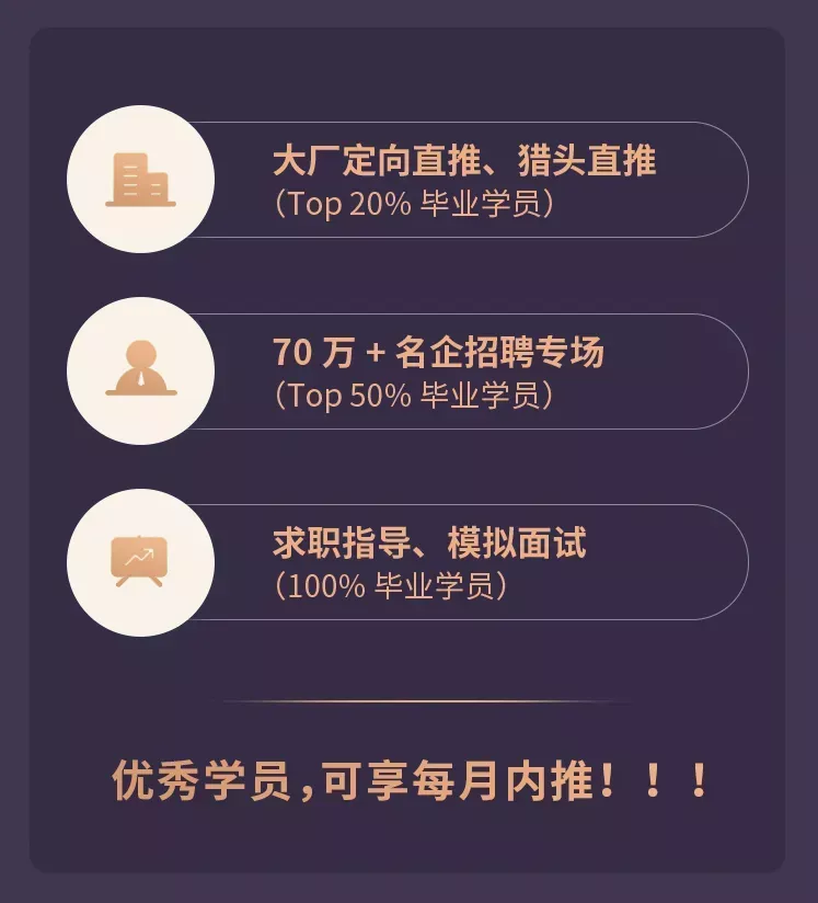 大家应该了解,拉勾深耕互联网招聘多年,打通了「人才培养+人才输送 的闭环」,学完后,直接帮你内推到对口的大公司,相当于为企业定向招聘,从学习到就业一条龙服务,帮助互联网人快速成长,实现升职加薪。