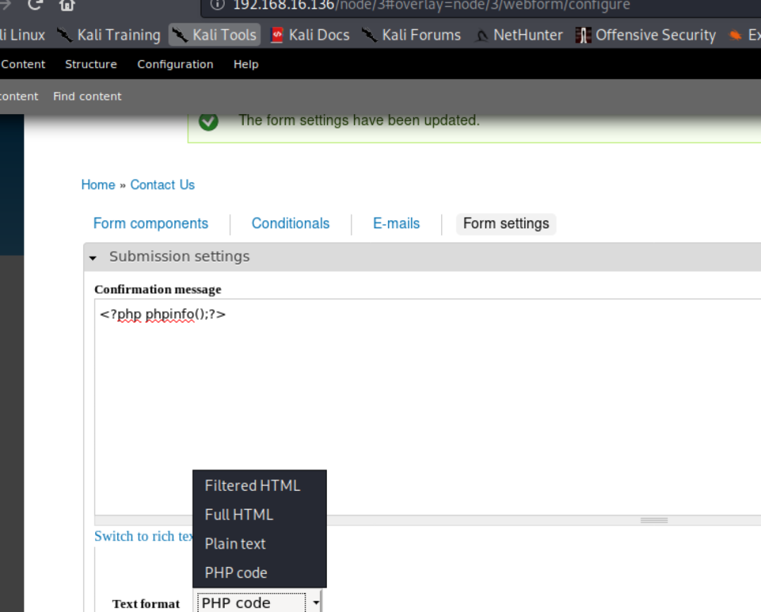 登录进去后查找相关信息,找到一个图片上传的点,但是暂时没有办法利用,又在contact us处找到了可疑的提交点,更改test format选项为PHP code,看看会有什么反应。