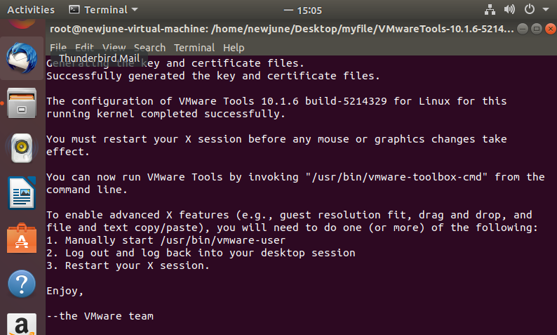 3、开始安装VMware Tools了,根据其提示输入yes/no,直到出现Enjoy, –the VMware team,就表示安装成功了,然后手动重启虚拟机。