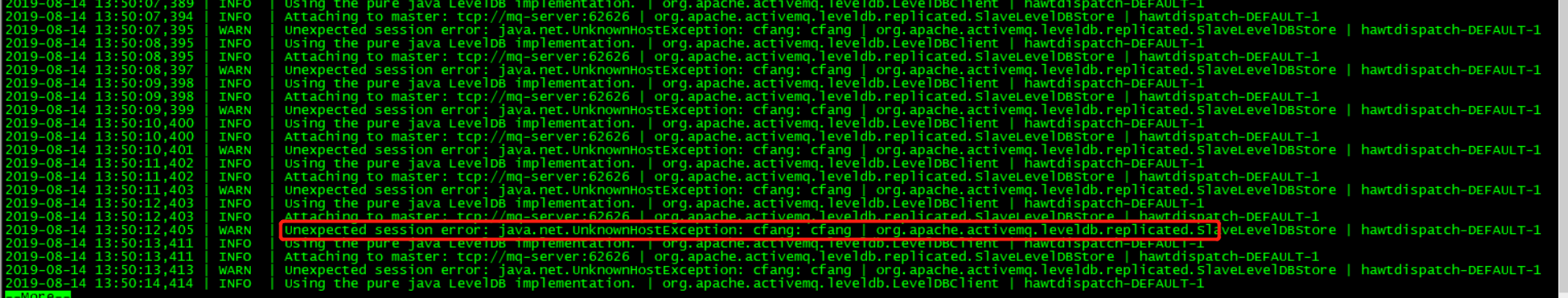 配置过程中个,3个 zk 应用和3个 ActiveMQ应用启动正常,从 zk 中查看ActiveMQ的主从也选举OK,但是,在访问ActiveMQ控制台以及发送消息的时候,就是不通。查看端口占用的,ActiveMQ提供服务的应用端口居然也没有正常监听。查看从应用的日志( ${activemq-home/data/activemq.log} ),发现一直报错: