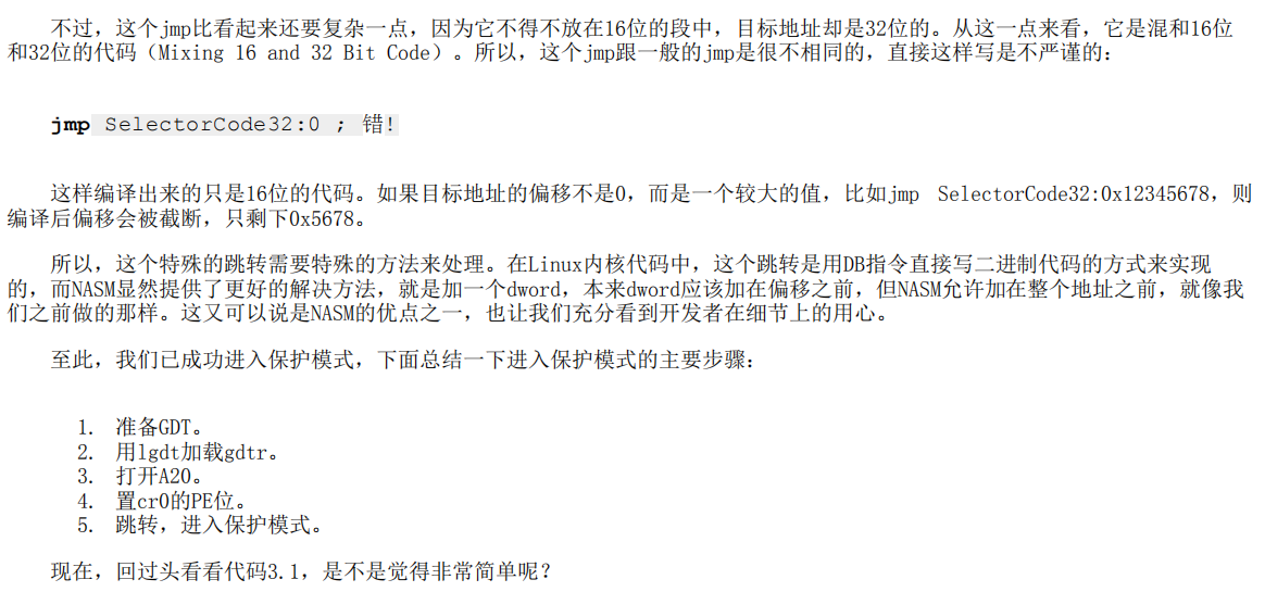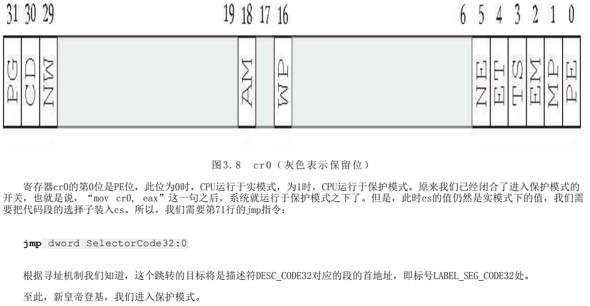 此时cs的值仍然是实模式下的值,把代码段的选择子装入cs: