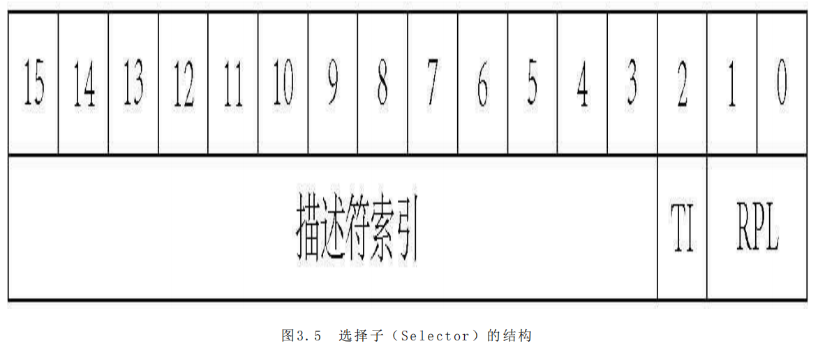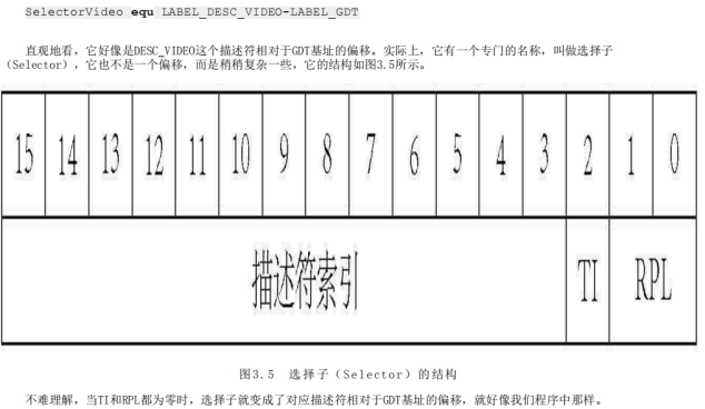 Selector为选择子,有其数据结构。在pmtest1.asm程序中,其作用就是偏移,对应描述符相对于GDT基址的偏移。