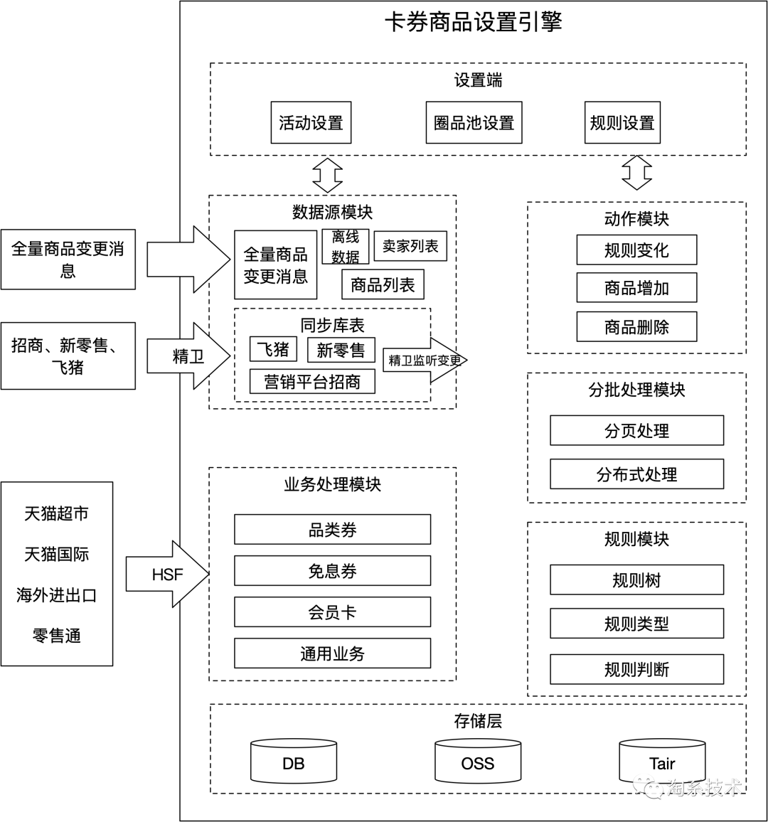 圈品框架图如图2.3所示,圈品可以划分为四个模块,分别是数据源模块、动作模块、规则模块和业务处理模块,设置端划分为三个部分:活动设置、圈品池设置、规则设置。接下来将围绕圈品四个核心模块进行讲解。