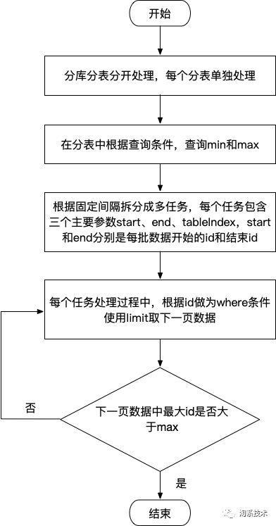 结合圈品实际情况使用该思路,首先通过min和max得到数据在表中分布的最小值和最大值,针对稀疏型数据分批间隔可以很大(为了解决任务数量过多问题,比如间隔是2W,即end-start=2w),start和end分别是每批数据对应的开始id和结束id,然后根据id做为where条件使用limit取下一页数据,接着根据下一页最大id做为where条件使用limit取后面的数据,一直循环下去,直到id>end,对于稀疏型数据,也许循环1-2次就完成了。流程图如下图3.12所示。