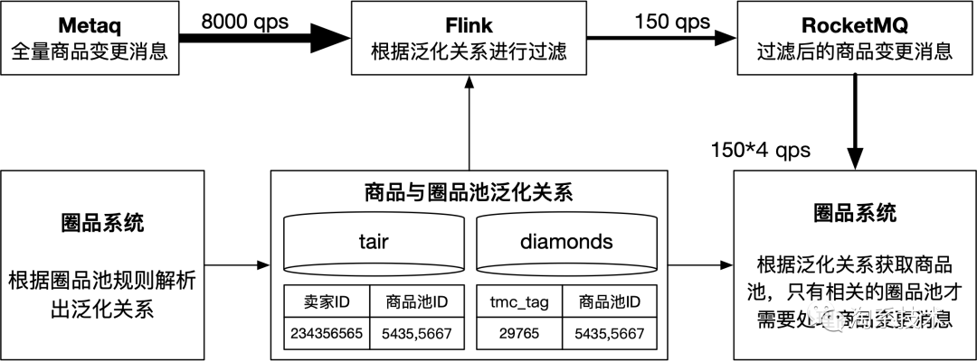 比如卖家圈品方式,当小二填写卖家列表后,这个圈品池与哪些卖家有关系就已经确定了,除此之外的卖家肯定不会跟这个圈品池发生关系,因此可以将卖家与圈品池的关系存入tair,供Blink过滤商品变更消息使用。卖家与圈品池的关系是比较通用的思路,其他圈品方式也可以转化成这种关系,比如商品列表圈品方式,当小二填入商品ID后,这些商品属于哪些卖家就确定了,除此之外的卖家的商品不会与该圈品池发生关系。