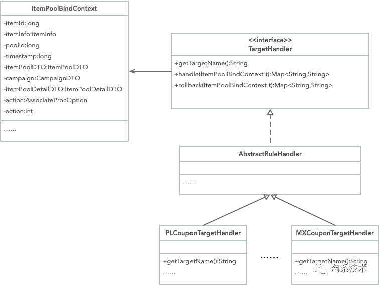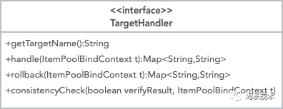 业务处理模块框架类图如图2.11所示,每一种业务都需要实现TargetHandler,其中handle方法处理圈品增加,rollback方法处理圈品删除。目前已经接入的几个大业务分别是:品类券、免息券、会员卡等。