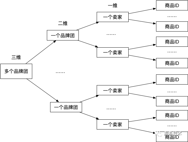 从上面定义可以看出,卖家列表规则既有可能是一维规则,也有可能是二维规则,当规则只包含一个卖家时为一维规则,当规则包含多个卖家时为二维规则。为了更好理解,拿上面的复杂规则来讲解,一个卖家有很多商品,一个品牌团有很多商家报名,如果现在运营设置圈多个品牌团下面所有商品,下图3.5所示是该规则降维的过程。