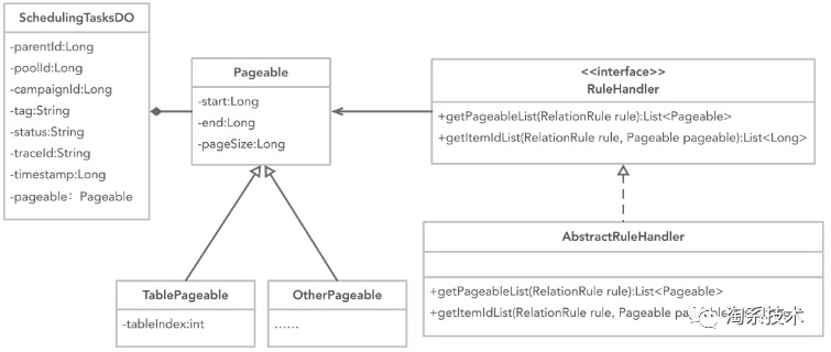在框架方面的调整如下图3.11所示,新增基础分批对象Pageable,考虑到和老框架到兼容,Pageable包含老框架的使用的分批参数start、end、pageSize,自定义分批对象TablePageable或其他都继承自Pageable,RuleHandler增加自定义分批方式getPageabelList,老框架的分批方式可以写在AbstractRuleHandler的getPageableList中,需要自定义分批方式的RuleHandler覆盖getPageabelList便可。