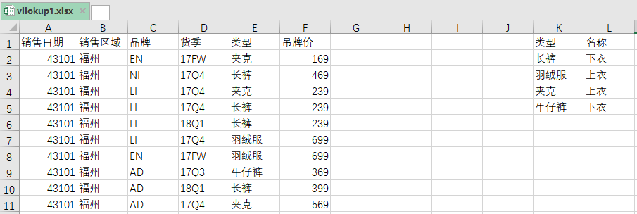 如图所示,有一个“ vlookup.xlsx ”文件,“ A1:F11 ”是我们的数据源区域,“ K1:L5 ”是我们的查找源区域。我们的目的就是要在数据源区域的 G 列加一列数据,查找出不同类型下名称表示。