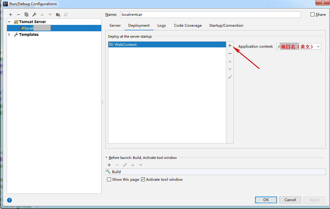 点击“+”添加项目下“WEB-INF”所在目录,在右边的“Application context”里配置“/项目名”。然后点击应用(apply),最后点击OK,就可以了。