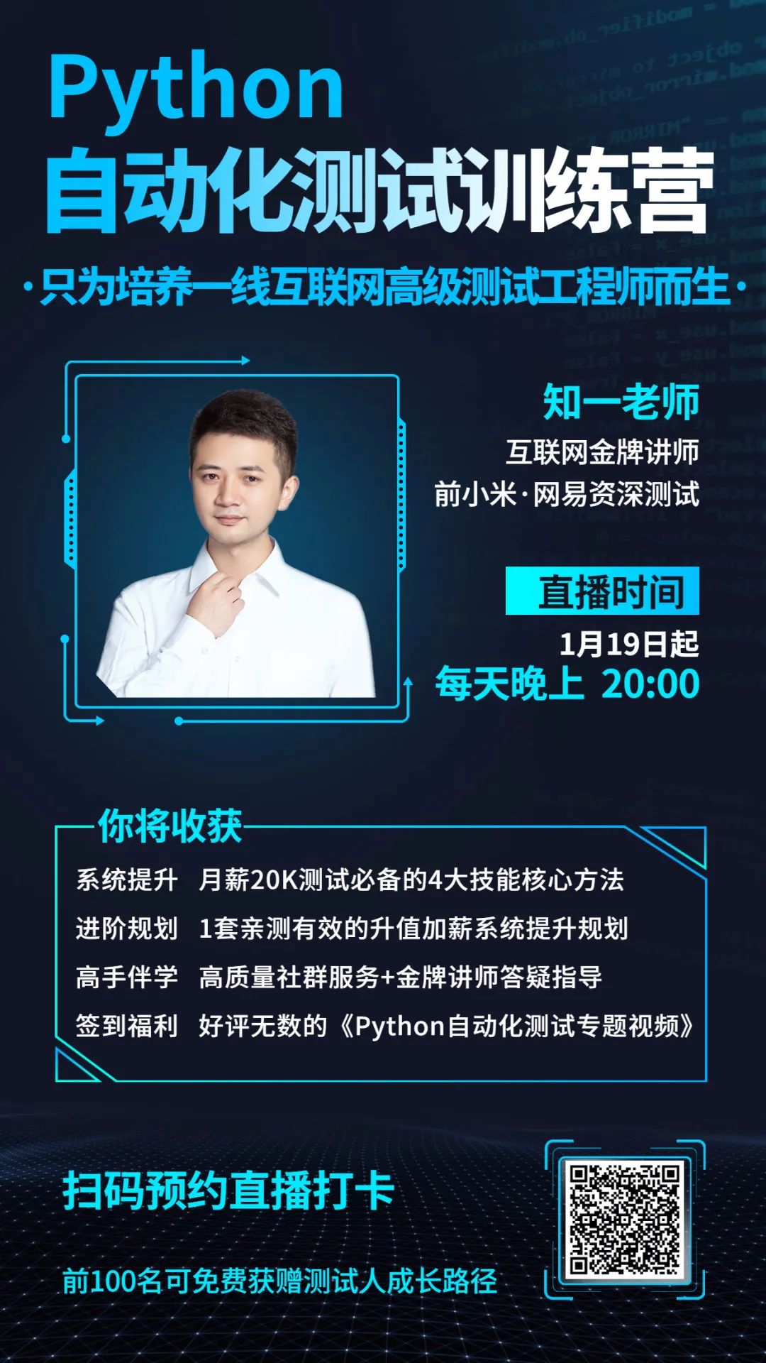 《Python自动化测试打卡训练营》是由小米系测试总监,华测在线创始人&CEO 知一老师 亲自研发打造,专为 0-3 年测试打造的一门技能提升课。