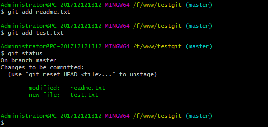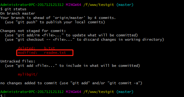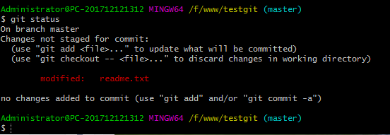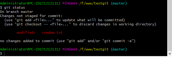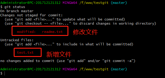 我们在readme.txt再添加一行内容为7777,接着在目录下新建一个文件为test.txt 内容为test,我们先用命令 git status来查看下状态,如下: