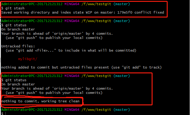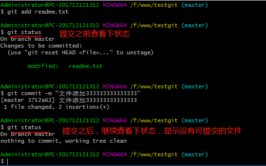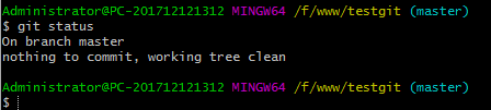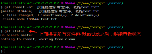 现在我们已经提交了一个readme.txt文件了,可以通过命令 git status 来查看是否还有文件未提交,如下: