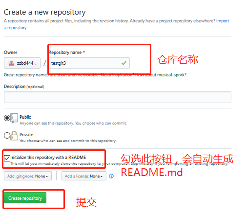 首先,登录github,创建一个新的仓库,名字叫testgit3.如下: