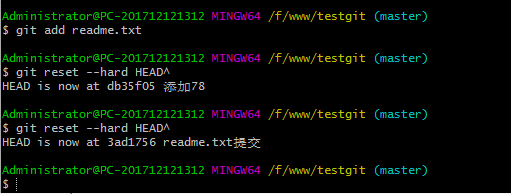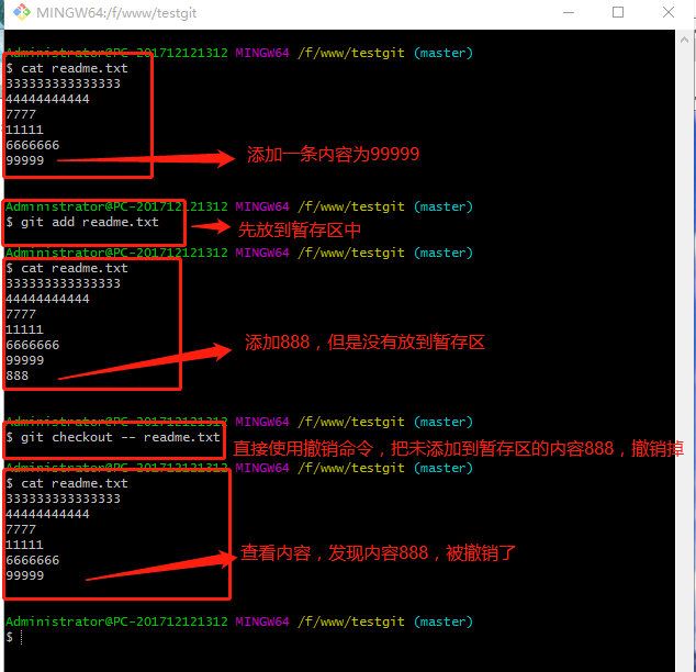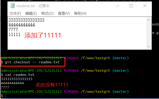 git checkout -- readme.txt(--与readme之间要有个空格),如下所示: