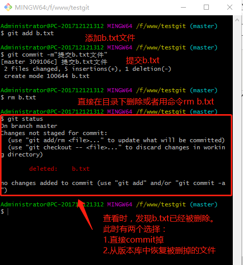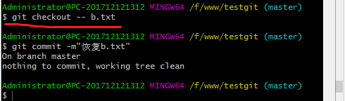 可以使用如下命令 git checkout -- b.txt,如下所示: