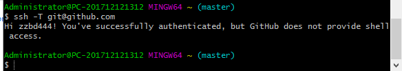 回车就会看到:You’ve successfully authenticated, but GitHub does not provide shell access 。这就表示已成功连上github。
