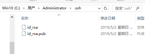 重新查看我们的用户目录,发现是否多了一个“.ssh”目录,且该目录下存在两个文件:
