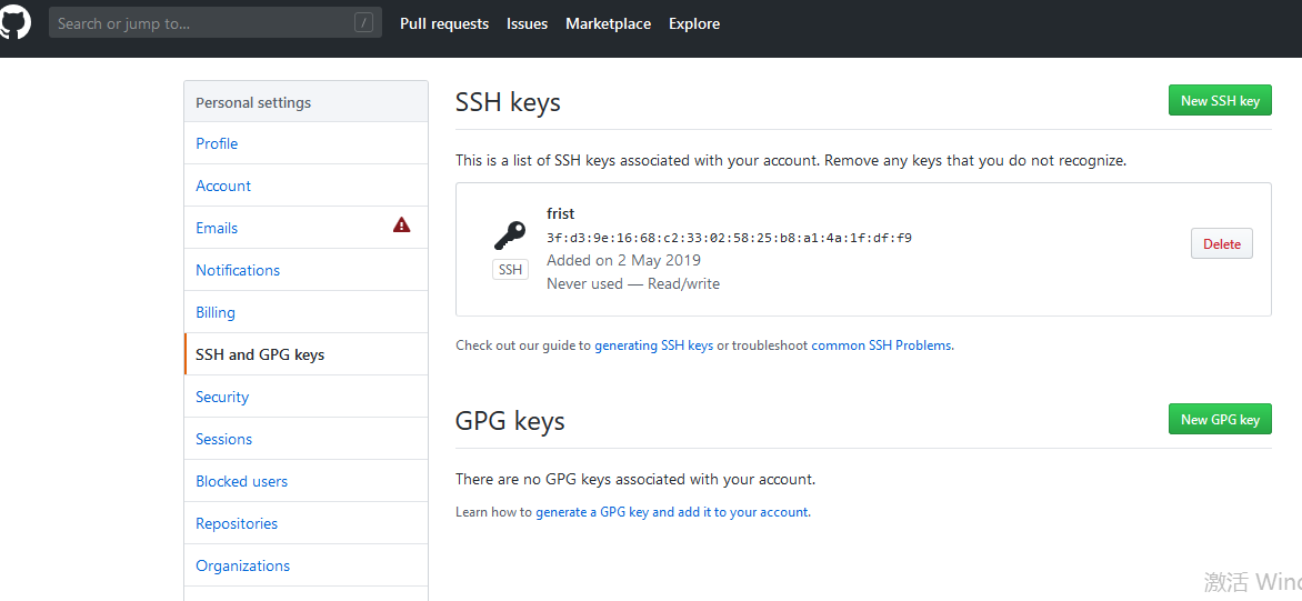 回到github网站,进入Account Settings,左边选择SSH Keys,Add SSH Key,