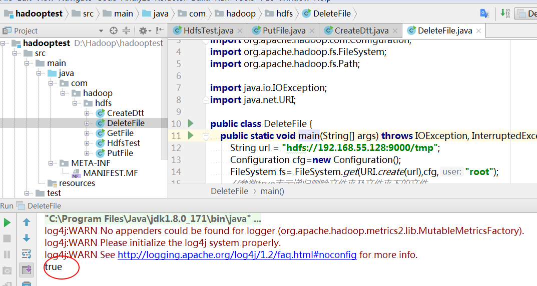 FileSystem fs= FileSystem.get(URI.create(dest),cfg,"root");语句中指定了root用户,这是因为Windows系统默认用户是Administrator。如果程序中不指定用户名root,则可能抛出异常:Permission denied: user=Administrator