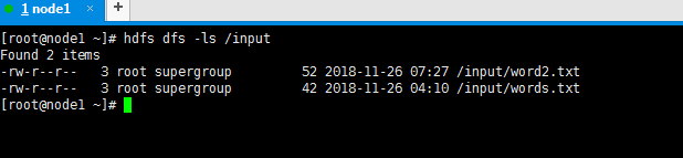 -rw-r--r--   3 root supergroup         52 2018-11-26 07:27 /input/word2.txt