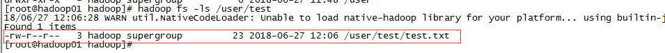 上传后通过命令查看hadoop fs -ls /user/test: