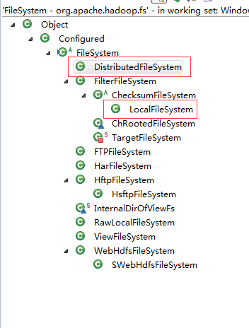 所有的操作都是通过抽象的文件系统FileSystem,要拿到具体实现类进行操作,下图是FileSystem所有的实现类,常用的DistributedFileSystem(分布式文件系统)、LocalFileSystem(本地文件系统)。