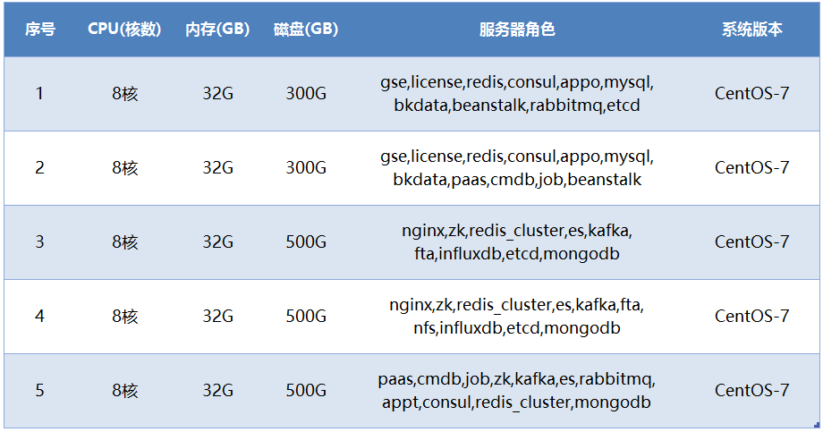 表1:蓝鲸企业版资源配置表(5台架构)