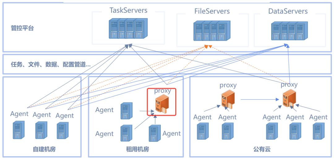 任意选择1-2台生产服务器,确保管控平台之间的通讯端口满足管理要求,并设置为Proxy模式,即可将区域的服务器纳管进来。