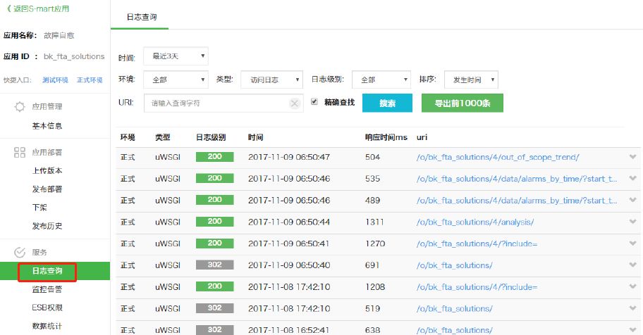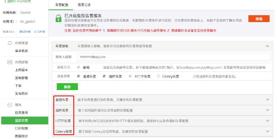 同时,SaaS部署使用docker进行隔离,提高蓝鲸SaaS安全性。开发者可以主动通过集成平台的日志查看功能来查看日志记录,同时平台提供了日志监控告警服务,开发者可以自行配置相应的告警参数、告警接收人等信息,实时监控日志数据。