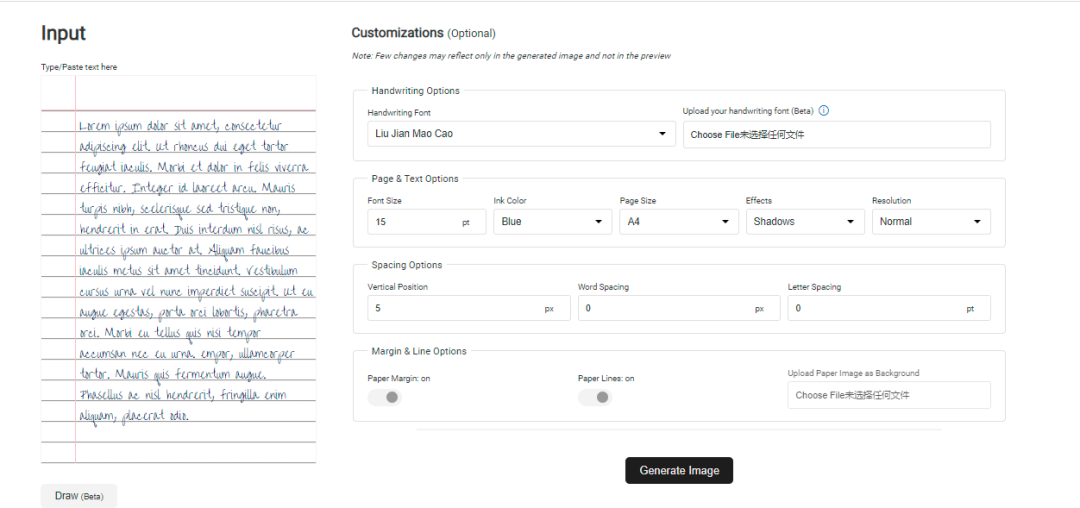 作者提供了一个在线地址供我们使用,地址是:https://saurabhdaware.github.io/text-to-handwriting/工具使用很简单,在左边 Input 输入需要转化的文字,右边选择手写字体,字体大小,图片尺寸,单词、字母间隙等,然后点击 Generate Image 按钮,即可生成手写体图片。
