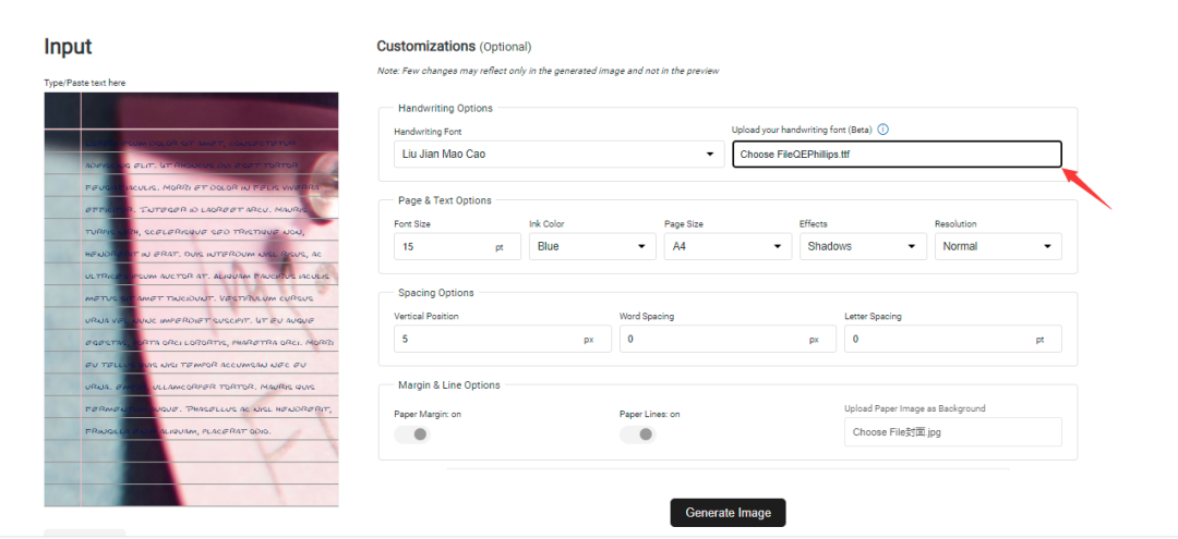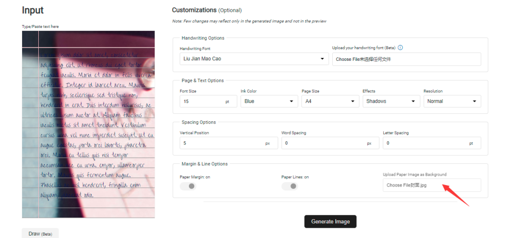 比较贴心的是,生成的图片手写体还能自定义背景图片,这样生成出来的图片就不会太过于单调了。