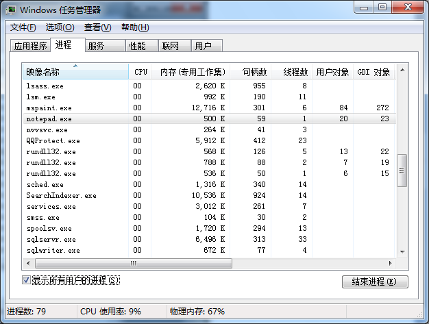 到现在为止,本文讨论的全是看不见的概念,有必要来直观的看一下系统中的句柄使用情况。有多种方式可以查看进程的句柄使用情况,先从两个工具开始,Windows任务管理器和Process Explorer。