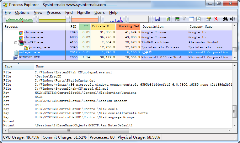 系统自带的任务管理器查看句柄数量很方便,但如果想知道这些句柄具体是什么,可以使用Process Explorer。Process Explorer是Windows Sysinternals工具包中的一个进程查看器,可以从这里下载。如果你看到的视图跟下图不同,可以点击View,选中Show Lower Pane,并在Lower Pane View中选择Handles。在列表中选择进程后,下方面板中会显示该进程中句柄的详细列表。