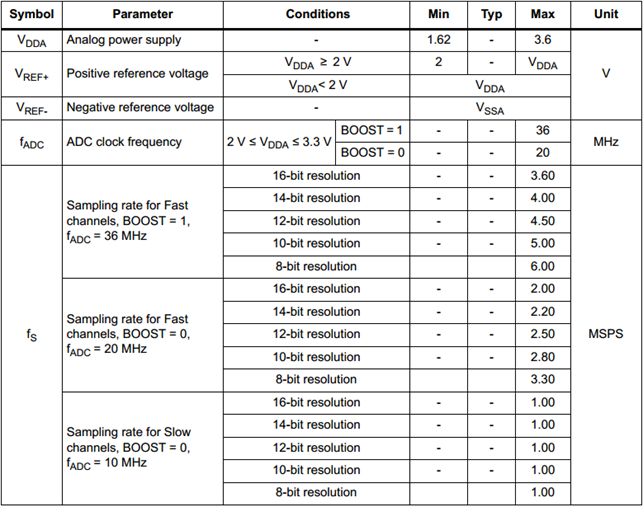- STM32H7的ADC采集通道体验快速通道Fast Channels和低速通道Slow Channels的区别,详情看本章2.12小节的电气特性。