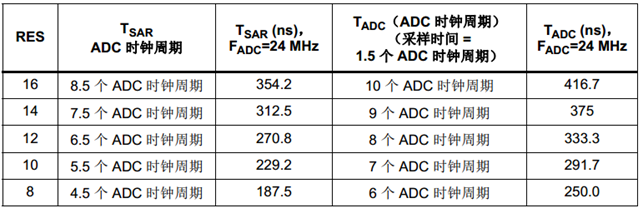 不同ADC分辨率对应的逐次逼近时间不同,具体数值如下: