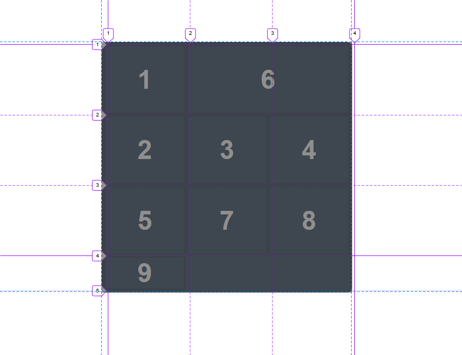前两个属性对应于垂直网格线,也就是列网格线的开始和结束。最后两个属性是指水平网格线,也就是行网格线的开始和结束。让我们分配正确的网格线编号来移动第 6 个框。