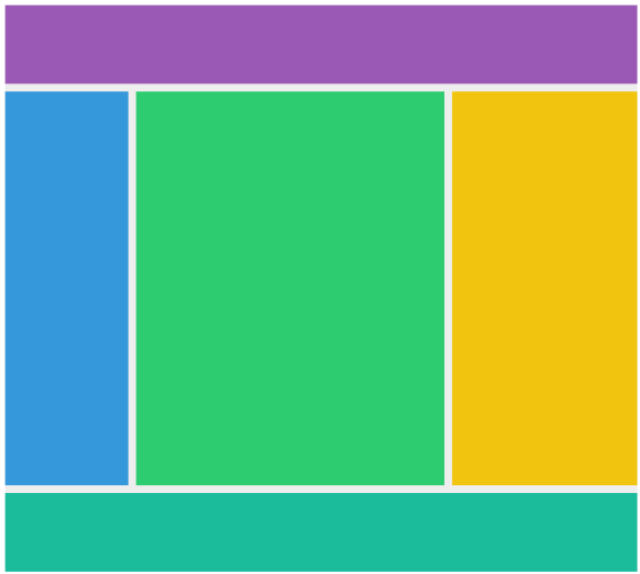 <html><head><meta charset="utf-8"><style>.container {display: grid;grid-template-rows: 1fr 5fr 1fr;grid-template-columns: 2fr 5fr 3fr;grid-template-areas: "header header header" "nav main aside" "footer footer footer";grid-gap: .75em;background-color: #eee;width: 100vw;height: 100vh;}header {grid-area: header;background-color: #9b59b6;}nav {grid-area: nav;background-color: #3498db;}main {grid-area: main;background-color: #2ecc71;}aside {grid-area: aside;background-color: #f1c40f;}footer {grid-area: footer;background-color: #1abc9c;}</style></head><body><div class="container"><header></header><nav></nav><main></main><aside></aside><footer></footer></div></body></html>