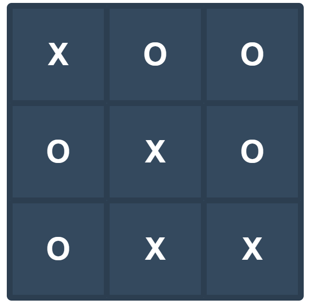 <html><head><meta charset="utf-8"><style>.game-board {width: 600px;height: 600px;margin: 0 auto;background-color: #34495e;color: #fff;border: 6px solid #2c3e50;border-radius: 10px;display: grid;grid-template: repeat(3, 1fr) / repeat(3, 1fr);}.box {border: 6px solid #2c3e50;border-radius: 2px;font-family: Helvetica;font-weight: bold;font-size: 4em;display: flex;justify-content: center;align-items: center;}</style></head><body><div class="game-board"><div class="box">X</div><div class="box">O</div><div class="box">O</div><div class="box">O</div><div class="box">X</div><div class="box">O</div><div class="box">O</div><div class="box">X</div><div class="box">X</div></div></body></html>