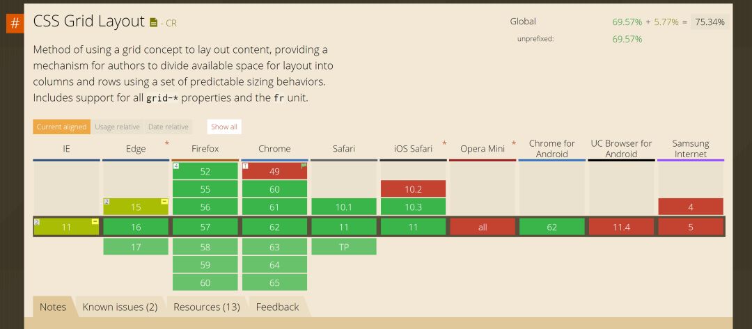 在写这篇文章的时候,CSS Grid 布局很多浏览器已经原生支持。根据 caniuse.com 的统计,所有主流浏览器都支持CSS Grid 布局,Internet Explorer 11 部分支持 -ms- 前缀, Opera Mini 根本不支持。