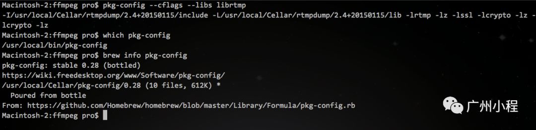 小程之前介绍怎么给视频添加水印时,就已经提到FFmpeg的编译,因为需要在编译时指定滤镜的功能,读者可以关注“广州小程”微信公众号并查阅这篇文章(音视频->FFmpeg应用)。