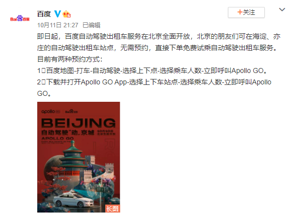 今年10月11日,百度官方宣布,即日起,百度自动驾驶出租车服务在北京全面开放。