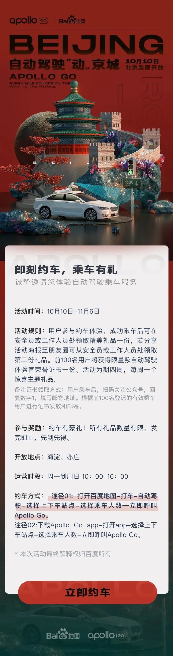 北京的朋友们可在海淀区、亦庄的自动驾驶出租车站点,无需预约,直接下单免费试乘自动驾驶出租车服务。