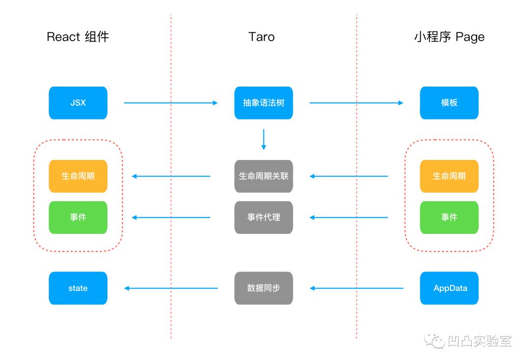也就是说,对于微信小程序这样不开放不开源的端,我们可以先把 React 代码分析成一颗抽象语法树,根据这颗树生成小程序支持的模板代码,再做一个小程序运行时框架处理事件和生命周期与小程序框架兼容,然后把业务代码跑在运行时框架就完成了小程序端的适配。