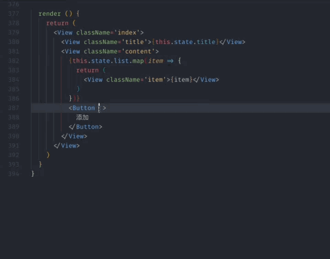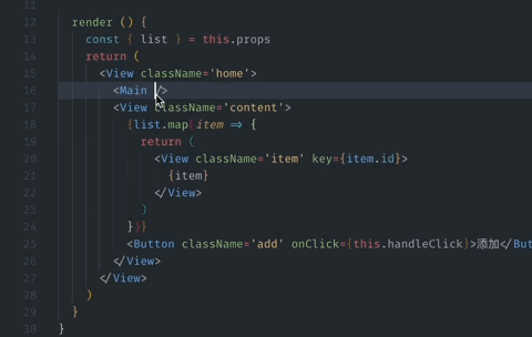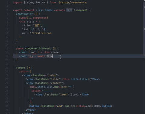 鉴于 Taro 的语法和 React 完全一样,因此编辑器/IDE 能够对 Taro 的支持和 React 是几乎一样的。现代的编辑器默认都对 JSX 进行了支持,如果没有,找一个插件也是非常容易的事情。但毕竟我们做 Taro 就是为了提升开发效率和开发体验,而真正使用 Taro 的人就是我们自己或正坐在我们旁边的同事。因此在此基础上,我们又对 Taro 开发体验进行了进一步加强。