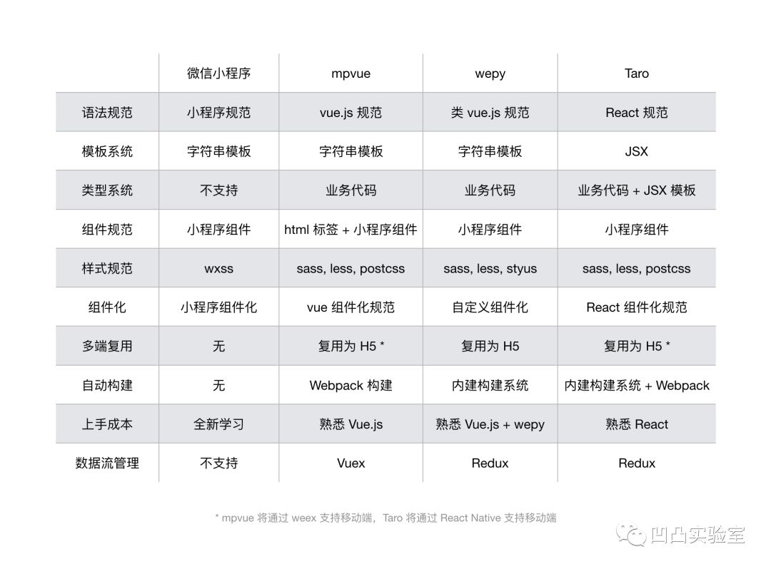 在我们前面社区已经有多个优秀的框架以小程序为核心对多端适配进行了探索,我们将各个开发框架的主要特点和特性进行了对比并制成图表。大家可以结合团队技术栈、技术需求以及框架特点、特性进行选型和权衡。