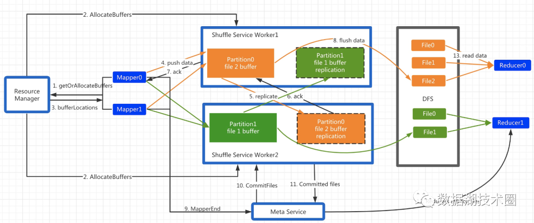为了不阻塞PushData的请求,Worker收到PushData请求后会以纯异步的方式交由专有的线程池异步处理。根据该Data所属的Partition拷贝到事先分配的buffer里,若buffer满了则触发flush。RSS支持多种存储后端,包括DFS和Local。若后端是DFS,则主从副本只有一方会flush,依靠DFS的双副本保证容错;若后端是Local,则主从双方都会flush。