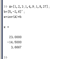 求一个矩阵的逆是一件非常烦琐的工作,容易出错,但在MATLAB中,求一个矩阵的逆非常容易。求方阵A的逆矩阵可调用函数inv(A)。