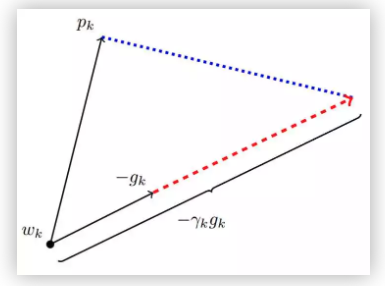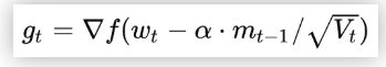 这一方法也称为NAG,即 Nesterov Accelerated Gradient,是在SGD、SGD-M 的基础上的进一步改进,改进点在于步骤 1。我们知道在时刻 t 的主要下降方向是由累积动量决定的,自己的梯度方向说了也不算,那与其看当前梯度方向,不如先看看如果跟着累积动量走了一步,那个时候再怎么走。因此,NAG在步骤 1,不计算当前位置的梯度方向,而是计算如果按照累积动量走了一步,那个时候的下降方向: