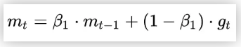 一阶动量是各个时刻梯度方向的指数移动平均值,约等于最近 1/(1-β1) 个时刻的梯度向量和的平均值。
